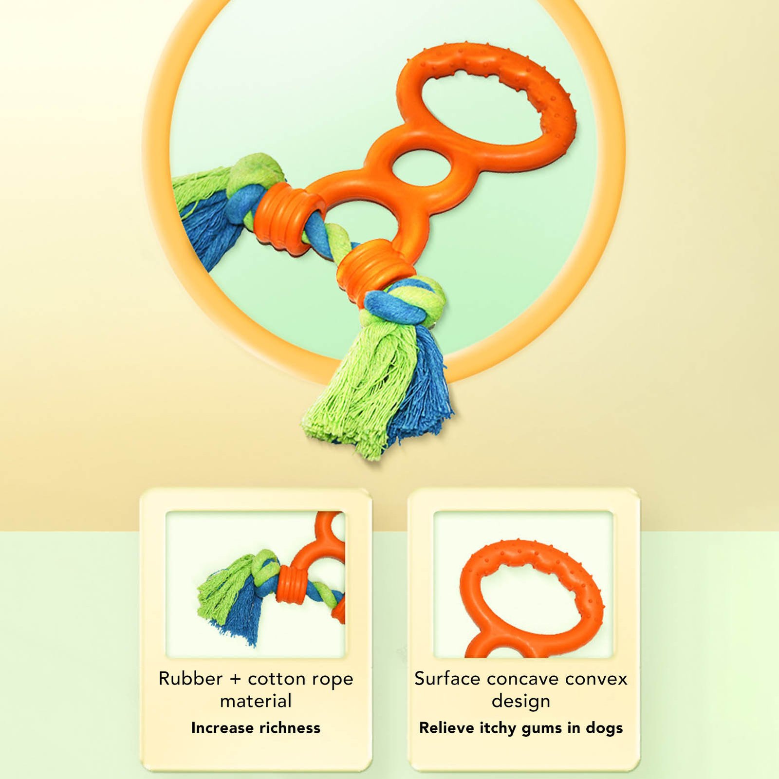 1、COTTON ROPE: Constructed of cotton rope, evenly distributes the tension and pressure from chewing. The surface of the ring is concave and convex to relieve itchy gums in dogs.